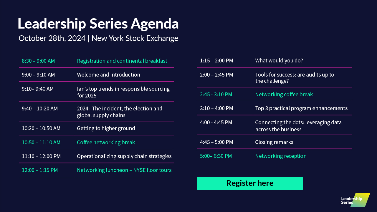 From exploring the implications of the anti-ESG movement to examining the role of AI and data integration in ethical sourcing, our expert speakers and panelists will provide actionable insights to help you navigate today's complex supply chain landscape. Highlights include interactive group exercises, exclusive presentations on emerging risks and opportunities, and opportunities to network with peers while touring the NYSE floor.
