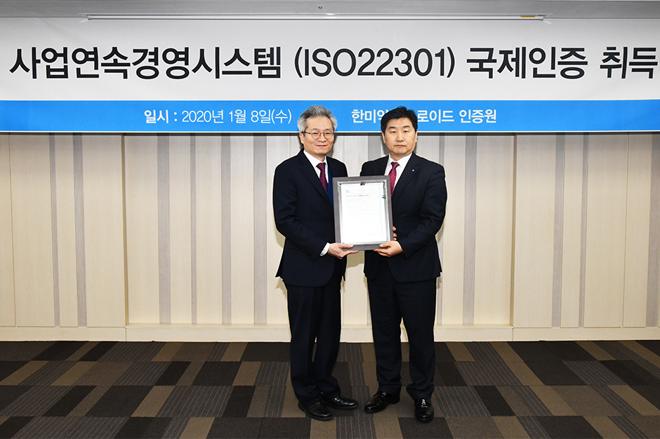매년 매출의 15% 이상을 R&D에 투자할 정도로 적극적인 연구개발을 바탕으로 글로벌 기업으로 거듭나고 있는 한미약품그룹국내 제약업체 최초로 ISO 22301 사업연속성경영시스템 인증을 받아, 이를 기념하기 위해 1월 8일 한미약품 서울 본사에서 인증수여식이 개최되었습니다.